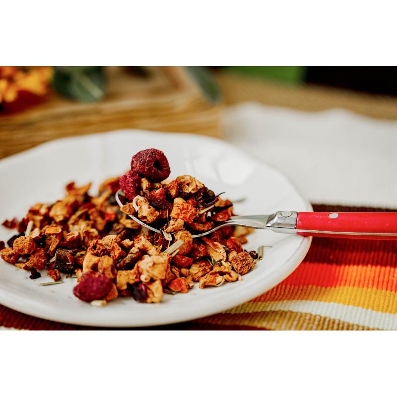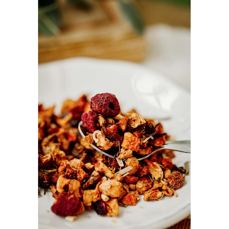 Ingrédients : pommes*, arôme naturel de framboise, hibiscus*, cynorhodon*, ananas*, citronnelle*, framboises* 2%, pétales de souci*.
