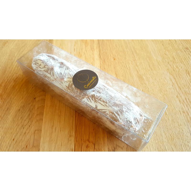 Saucisson à la guimauve, amandes torrifiées, chocolat noir et praliné. Poids: 150 g