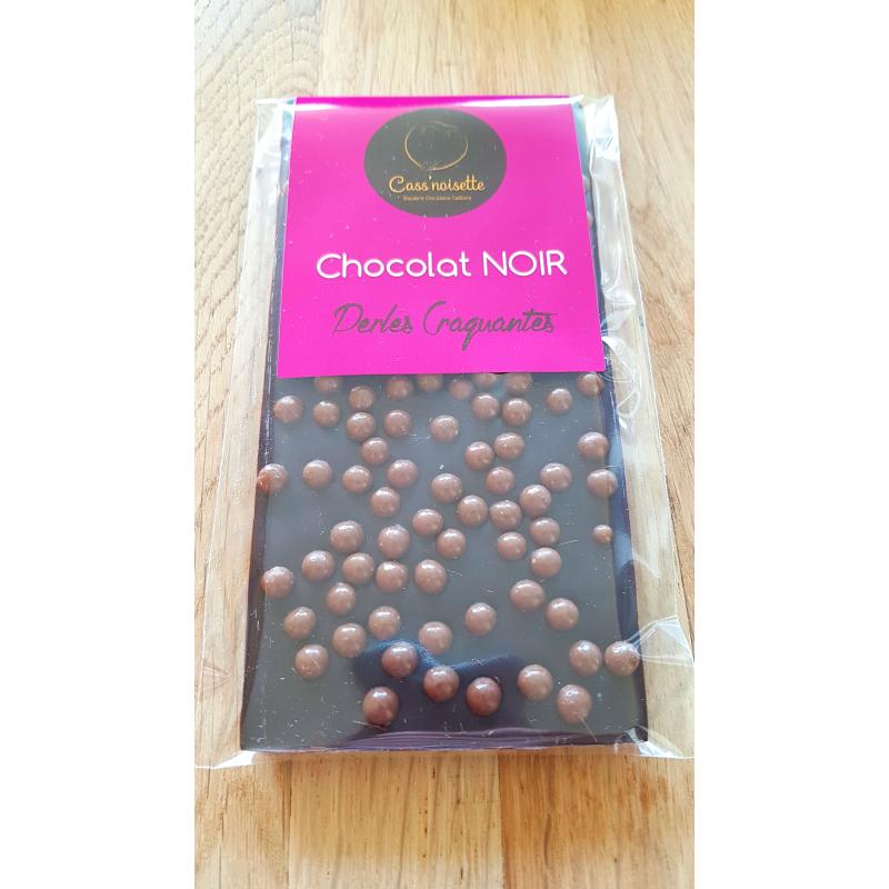 Tablette au chocolat noir garnie de perles craquantes. Poids: 100 g