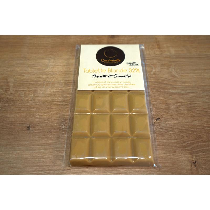 Tablette blonde 32 % aux notes biscuitées et caramélisées. Poids: 100 g