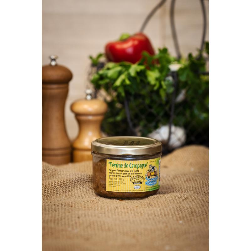 Terrine pur porc fermier élevé à la ferme nourri à base de petit lait et d'aliments garantis à 99 % sans OGM.