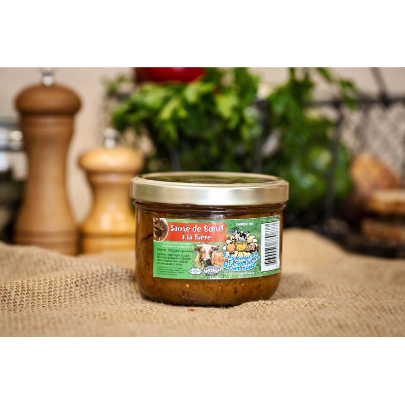 Ingrédients : Maigre et gras de boeuf, bière et miel du Roannais "La part des autres", fécule de maïs, moutarde, sel, poivre, ail, laurier, épices.